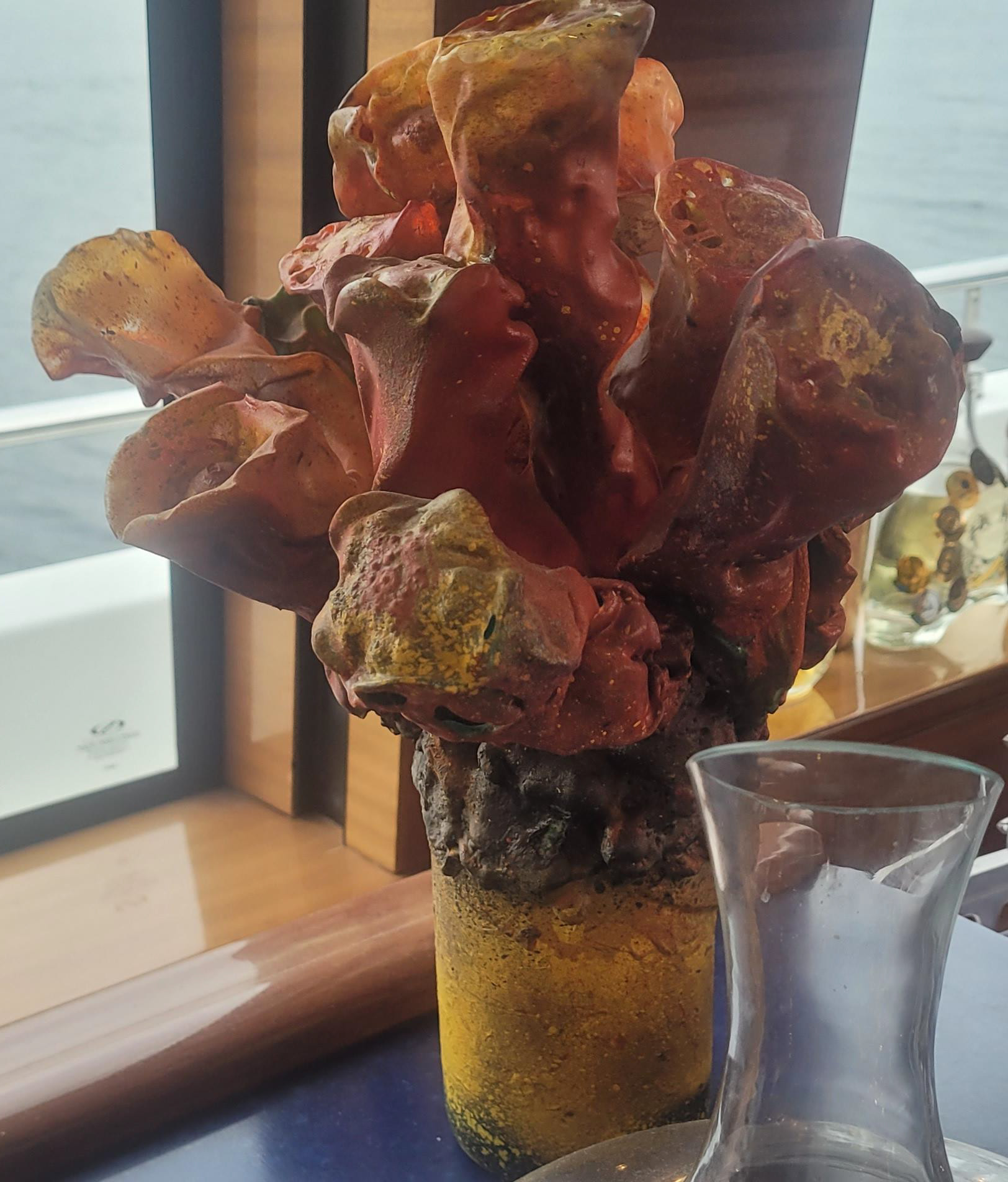 Garrafas plásticas derretidas, garrafa de vidro cortada.